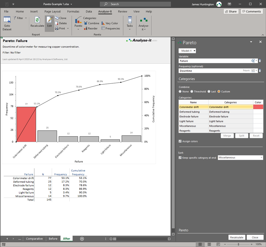 Pareto charts to identify the most frequently occurring defects and prioritise improvement effort. One-way and two-way comparative Pareto charts to analyse by a second factor such as operator, shift, or product line. Merge, reorder, and colour bars to highlight the most important categories.
