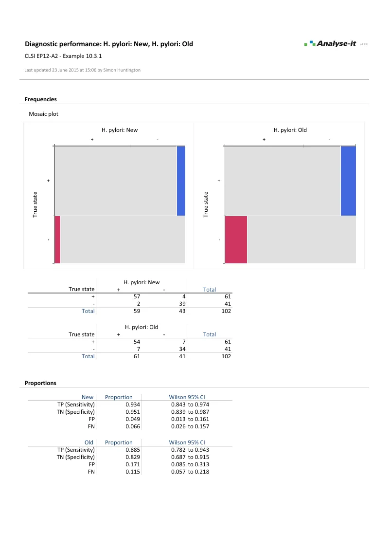 - Sensitivity, specificity with Clopper–Pearson exact or Wilson score CI