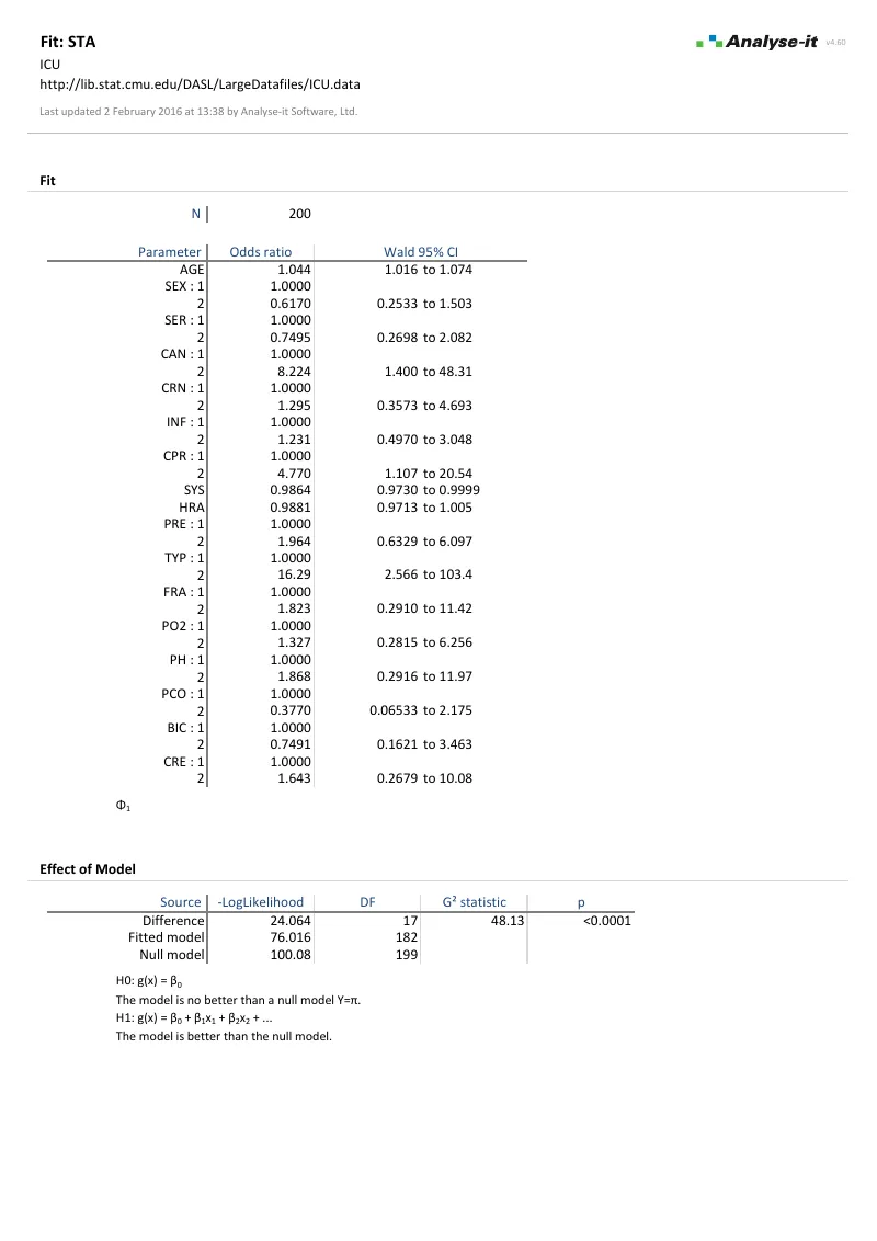 - Binary logistic regression with odds ratios and Wald confidence intervals