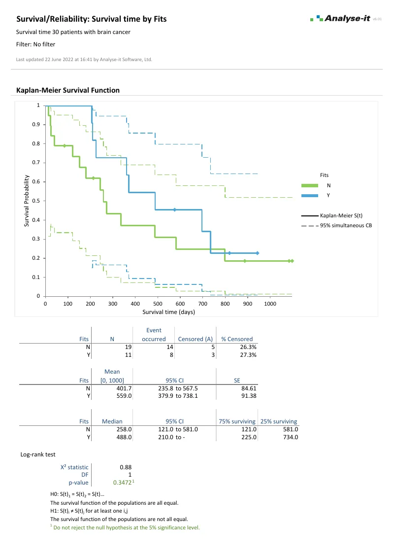 - Kaplan–Meier survival curve with pointwise, Nair, or Hall–Wellner confidence bands