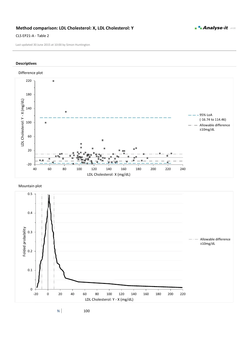 Mean bias and median bias with confidence intervals. 95% limits of agreement show the range within which differences between the two methods are expected to fall. Overlay an allowable difference specification — such as ±4 mmol/L for glucose or ±10 mg/dL for LDL cholesterol — to see immediately whether agreement meets clinical requirements. Difference plot with histogram of differences.