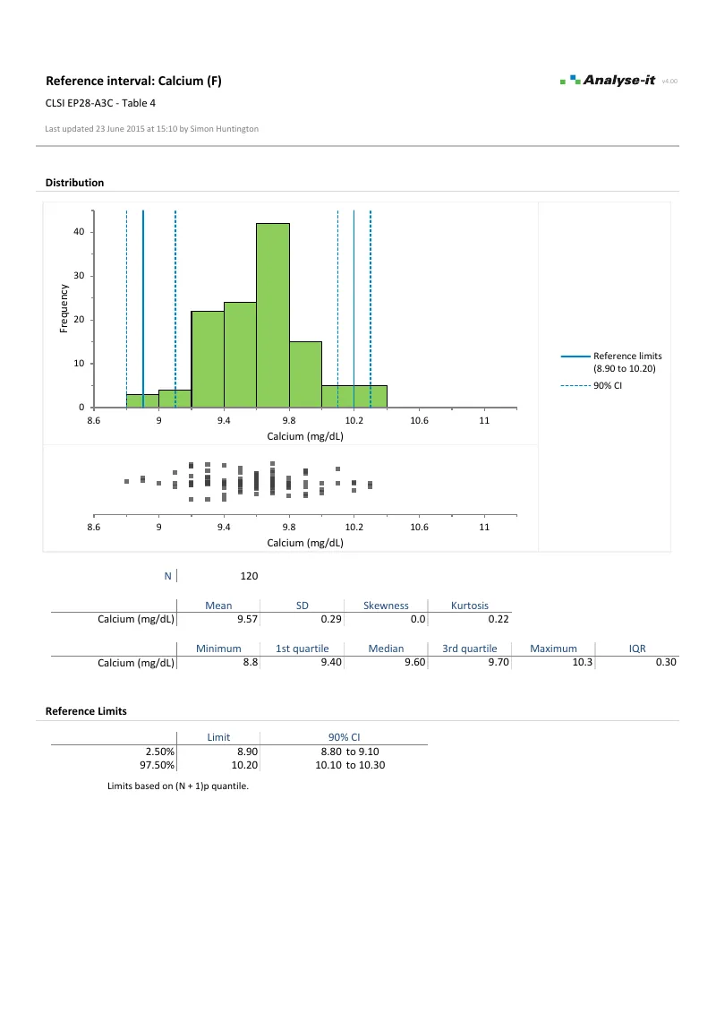 See reference interval results in detail — partitioned intervals, histograms with reference limits, and outlier screening — using example datasets you can download and follow along with.