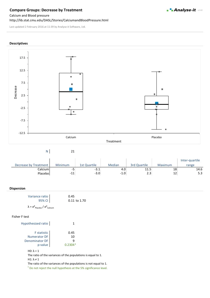 2 groups (11 calcium, 10 placebo). Side-by-side box plots, Fisher F-test, independent-samples t-test against hypothesised difference of 3.