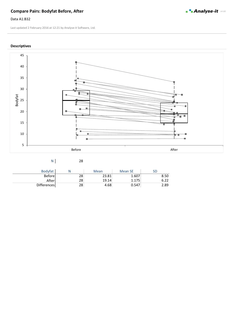 Body fat before and after exercise.