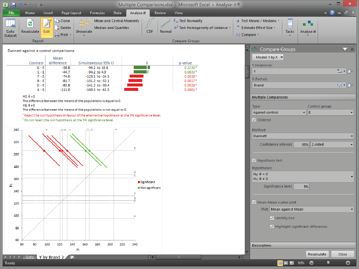A significant ANOVA tells you the groups aren’t all equal — but not which ones differ. Nine multiple comparison procedures answer the specific follow-up question: all pairs with Tukey-Kramer, against a control with Dunnett, with the best using Hsu. Non-parametric alternatives with Steel and Dwass-Steel-Critchlow-Fligner. The Mean-Mean scatter plot shows every pairwise difference at a glance.